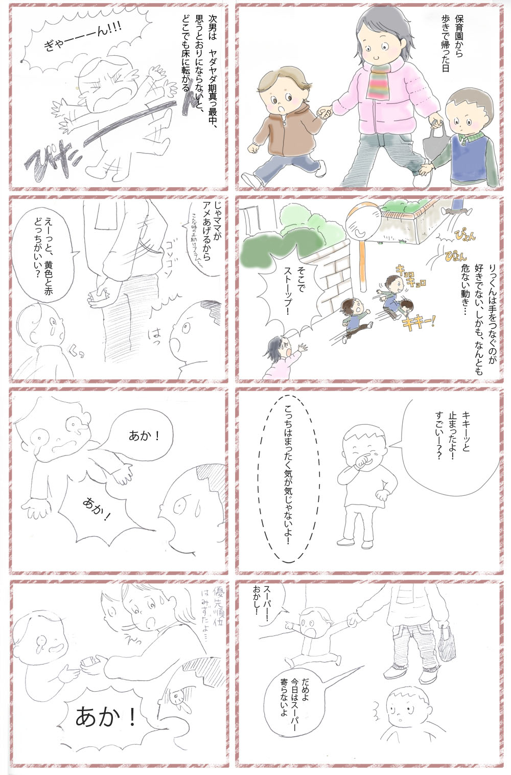 長男はやっとこ4歳になり、私もママ歴4年になりました。次男は2歳、やだやだ期に入りました。二児の男の子を持つとまるで修行のようにつらい日々、でも息子たちの笑顔、あどけない姿をみると、疲れもふっとび、またがんばれます